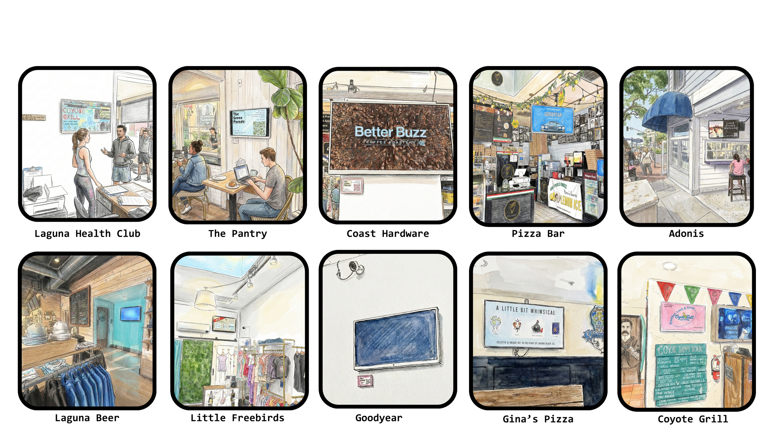 LAGUNA BEER | THE PANTRY | LAGUNA HEALTH CLUB | GINA'S PIZZA | COAST HARDWARE | LITTLE FREEBIRDS | GOODYEAR | COYOTE GRILL | ADONIS RESTAURANT | PIZZA BAR